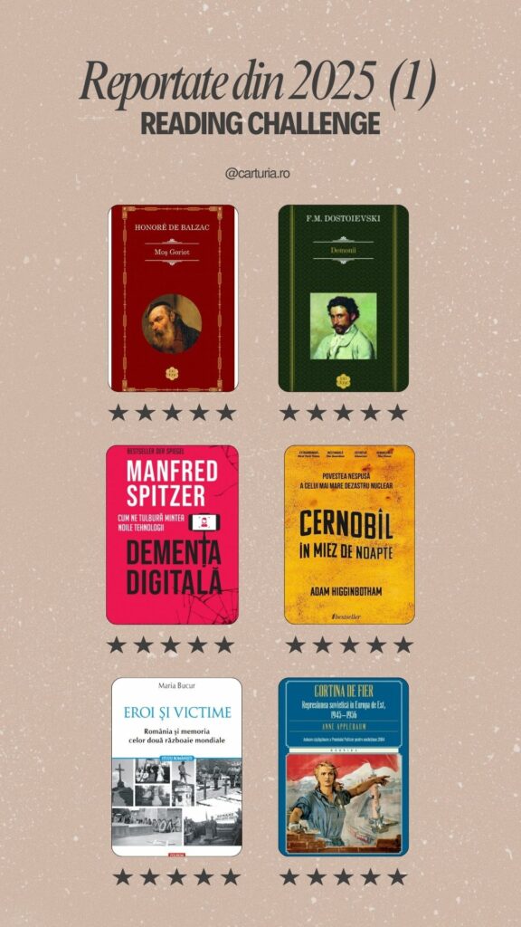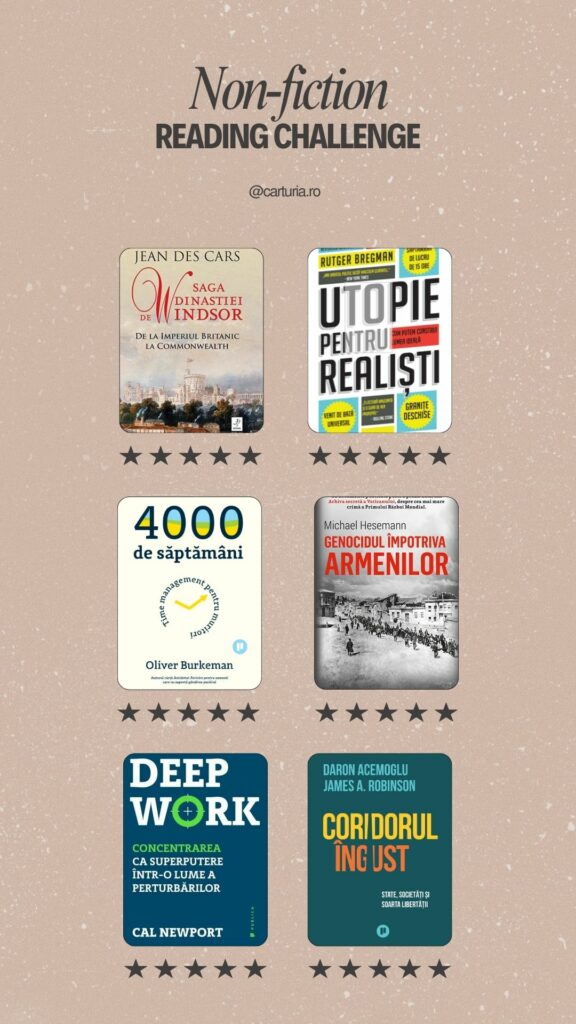 În categoria cărților de non-ficțiune am făcut un mix de istorie, self-help și ceva politică și economie. Avem: Saga dinastiei de Windsor de Jean des Cars (pentru că mi-a plăcut mult de tot Saga favoritelor), Utopie pentru realiști de Rutger Bregman, 4000 de săptămâni de Oliver Burkeman, Deep work de Cal Newport (aleasă pentru cuvântul concentrarea de pe copertă), și Coridorul îngust de Daron Acemoglu și James A. Robinson.