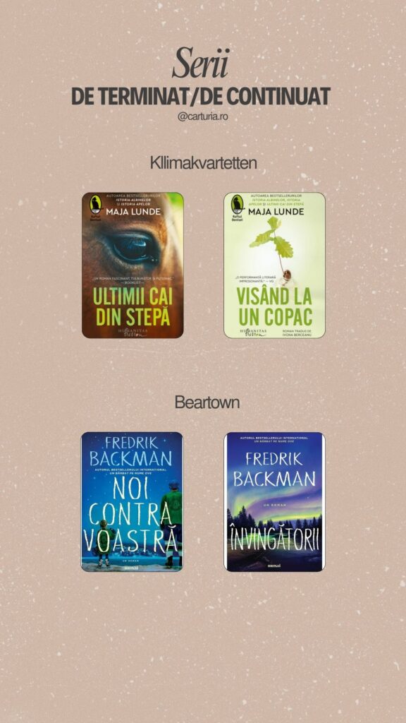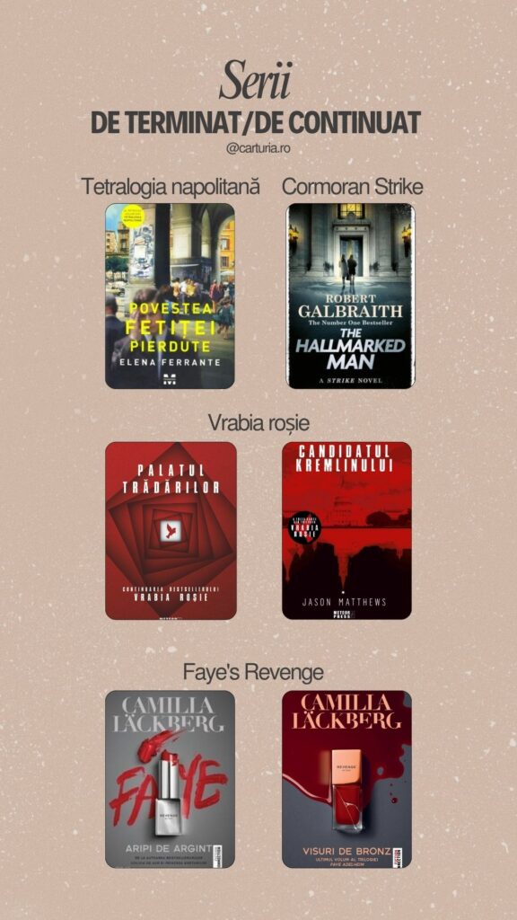 Pe lângă toate acestea, îmi doresc să continui sau să termin câteva serii, dar și să încep unele noi. Am trecut pe lista celor de continuat sau de terminat șase serii: Tetralogia napolitană de Elena Ferrante (volumul 4), Comoron Strike de Robert Galbraith (volumul 8, seria mai continuă, dar acesta este cel mai recent volum), Vrabia roșie de Jason Matthews (volumele 2 și 3), Răzbunarea lui Faye de Camilla Lackberg (volumele 2 și 3), Klimakvartetten sau Cvartetul climei (?) de Maja Lunde (volumele 3 și 4) și Beartown de Fredrik Backman (volumele 2 și 3).