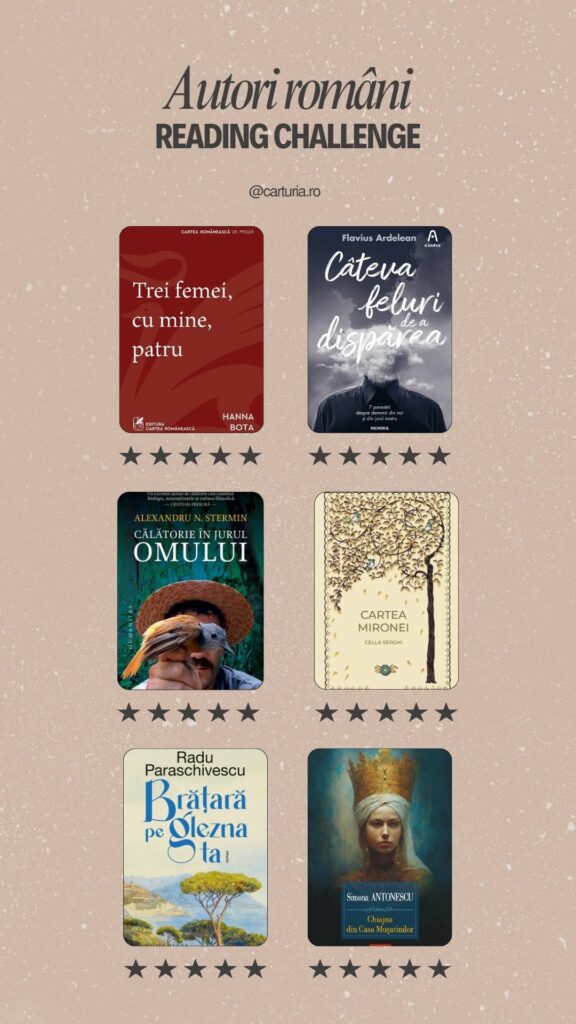 Pentru categoria autori români, am ales: Trei femei, cu mine, patru de Hanna Bota (influențată de Ștefania Istrate), Câteva feluri de a dispărea de Flavius Ardelean (dacă îmi amintesc corect, mi-a fost recomandată de Luciana Corlan), Călătorie în jurul omul ui de Alexandru N. Stermin (primită cadou de la Luciana), Cartea Mironei de Cella Serghi, Brățară pe glezna ta de Radu Paraschivescu și Chiajna din casa Mușatinilor de Simona Antonescu. Despre aeasta din urmă am auzit numai de bine încă de acum câțiva ani.