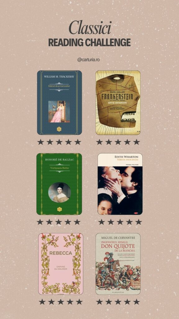În materie de clasici, am strâns destul de multe prin abonamentul Romane nemuritoare de la Litera dar și prin prisma altor achiziții. Așadar, am pus pe listă: Bâlciul deșertăciunilor de William M. Thackery, Frankestein de Mary Shelley, Verișoara Bette de Honoré de Balzac, Vârsta inocenței de Edith Wharton, Rebecca de Daphne du Maurier (foarte populară, în special în ultimii 2-3 ani), și Don Quijote de la Mancha de Cervantes.