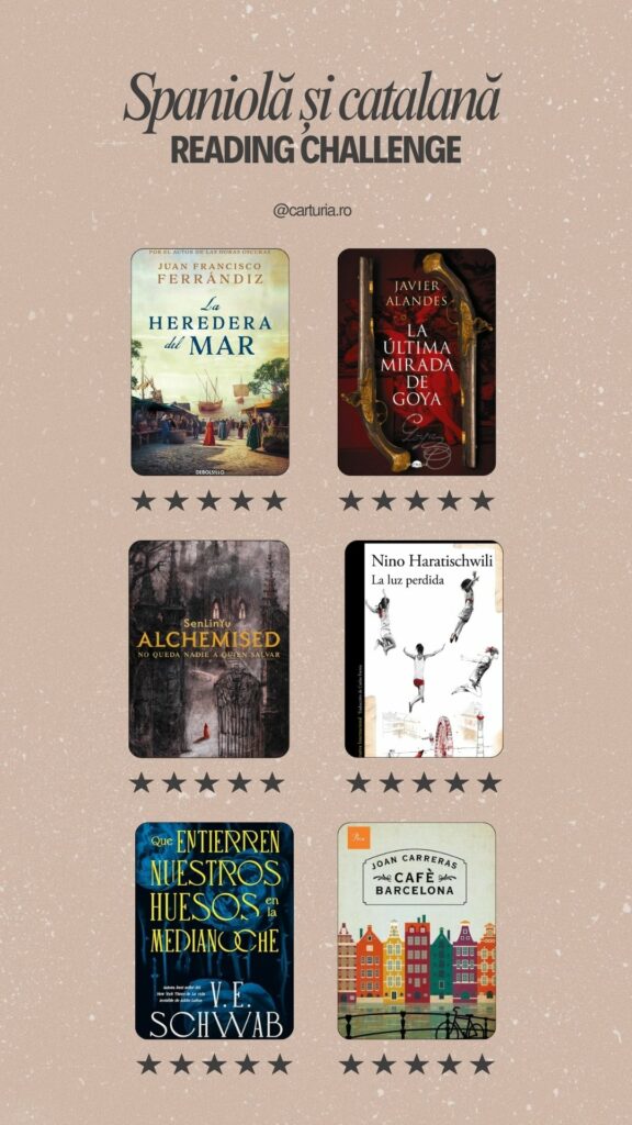 Dacă în cazul cărților în limba engleză, aveam suficiente titluri în bibliotecă din care să îmi aleg, în spaniolă și catalană am doar câteva rămase așa că am ales trei titluri din bibliotecă și trei ebooks: La heredera del mar de Juan Francisco Ferrándiz (luată după ce mi-a atras atenția că o citea cineva pe plajă), La última mirada de Goya de Javier Alandes (cumpărată după ce am citit sinopsisul), Alchemised de Sen Lin Yu (m-a convins hype-ul, sper să nu îmi pară rău), La luz perdida de Nino Haratischwili (în limba română Lumina care lipsea), Que entierren nuestros huesos en la medianoche de V.E. Schwab și Cafè Barcelona de Joan Carreras (cartea în catalană).